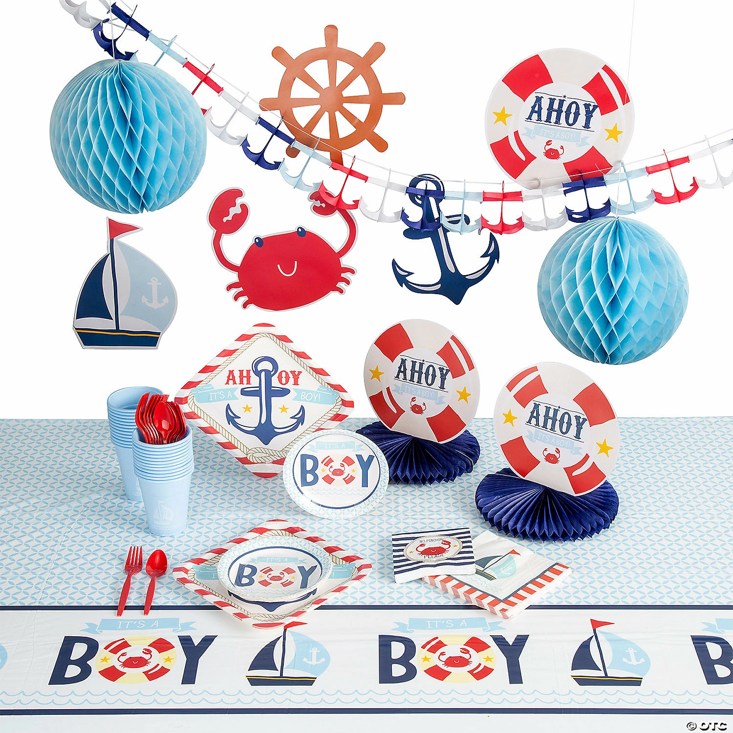Ahoy, itβs a boy! Celebrate the impending arrival of a lilβ skipper with this fun baby shower nautical theme. This fun kit makes it easy to throw an impressive baby shower for up to 8 guests. The βAhoy, itβs a boyβ theme will make guests smile, and having everything included in this kit from tableware to decorations will make you smile! (100 pcs. per unit) Assortment may vary.Includes:β’ 16 Paper Nautical Baby Shower Beverage Napkins (9″)β’ 1 Paper Nautical Boy Baby Shower Decorating Kit (Includes five 12″ cutouts, two 9″ tissue centerpieces, two 12″ honeycombs and one 12-ft. garland.)β’ 8 Paper Nautical Boy Baby Shower Dessert Plates (7 1/4″)β’ 25 Plastic Nautical Baby Shower Disposable Cups (4 1/2″ 16 oz.)β’ 16 Paper Nautical Baby Shower Luncheon Napkins (6 1/2″)β’ 8 Paper Nautical Boy Baby Shower Dinner Plates (9 1/4″)β’ 1 Plastic Nautical Boy Baby Shower Tablecloth (54″ x 108″ Disposable.)β’ 8 Plastic Red Fork & Spoon Cutlery Sets (2 pcs. per set)