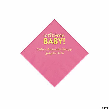 Cheap 🛒 Candy Pink Welcome Baby Personalized Napkins with Gold Foil – 50 Pc. Beverage 🔥