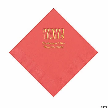 Commemorate your big day by adding Personalized Yay! Beverage or Luncheon Napkins to your wedding supplies. Custom napkins are a fun and affordable way to add a personal touch to your wedding reception, engagement party and bridal shower decorations. Personalize with the couples name and wedding date and use for all the special events leading up to the wedding ceremony. With so many colors to choose from, you can order custom napkins to complement the wedding colors for the wedding reception and order a smaller batch for the other wedding parties prior to the big day. Our low prices allow you to consider mixing and matching colors to stack throughout the wedding reception, couples shower, bachelorette party, etc. Yay! Personalize with 2 lines of text. Printed with gold or silver foil. Paper. (50 pcs. per unit) Beverage, 5″; luncheon, 6 1/2″. Not microwave safe. ยฉย OTC