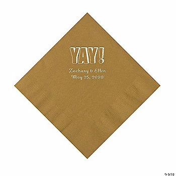 Commemorate your big day by adding Personalized Yay! Beverage or Luncheon Napkins to your wedding supplies. Custom napkins are a fun and affordable way to add a personal touch to your wedding reception, engagement party and bridal shower decorations. Personalize with the couples name and wedding date and use for all the special events leading up to the wedding ceremony. With so many colors to choose from, you can order custom napkins to complement the wedding colors for the wedding reception and order a smaller batch for the other wedding parties prior to the big day. Our low prices allow you to consider mixing and matching colors to stack throughout the wedding reception, couples shower, bachelorette party, etc. Yay! Personalize with 2 lines of text. Printed with gold or silver foil. Paper. (50 pcs. per unit) Beverage, 5″; luncheon, 6 1/2″. Not microwave safe. ยฉย OTC