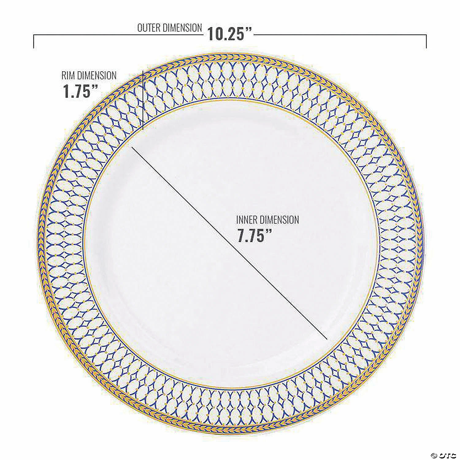 β’ Approx. inner diameter: 7 ΒΎ”β’ Approx. outer diameter:Β 10 ΒΌ”β’ Approx. outer rim diameter: 1 ΒΎ”β’ Case quantity: 12 packs of 10 platesβ’ Color: White with Blue and Gold Rimβ’ Shape: Roundβ’ Material: Plasticβ’ Disposable: One-time, single party useβ’ Recycling code: #6 PS Polystyreneβ’ BPA-free: Yes Special Shipping Information: This item ships separately from other items in your order. This item cannot ship to a P.O. Box. This item may be subject to additional processing days. ITEM IS NOT ELIGIBLE FOR EXPEDITED SHIPPING