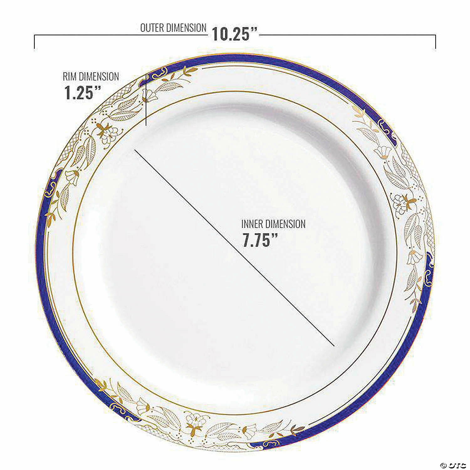 β’ Approx. inner diameter: 7 ΒΎ”β’ Approx. outer diameter: 10 ΒΌ”β’ Approx. outer rim diameter: 1 ΒΎ”β’ Case quantity: 12 packs of 10 platesβ’ Color: White with Blue and Gold Rimβ’ Shape: Roundβ’ Material: Plasticβ’ Disposable: One-time, single party useβ’ Recycling code: #6 PS Polystyreneβ’ BPA-free: Yes Special Shipping Information: This item ships separately from other items in your order. This item cannot ship to a P.O. Box. This item may be subject to additional processing days. ITEM IS NOT ELIGIBLE FOR EXPEDITED SHIPPING