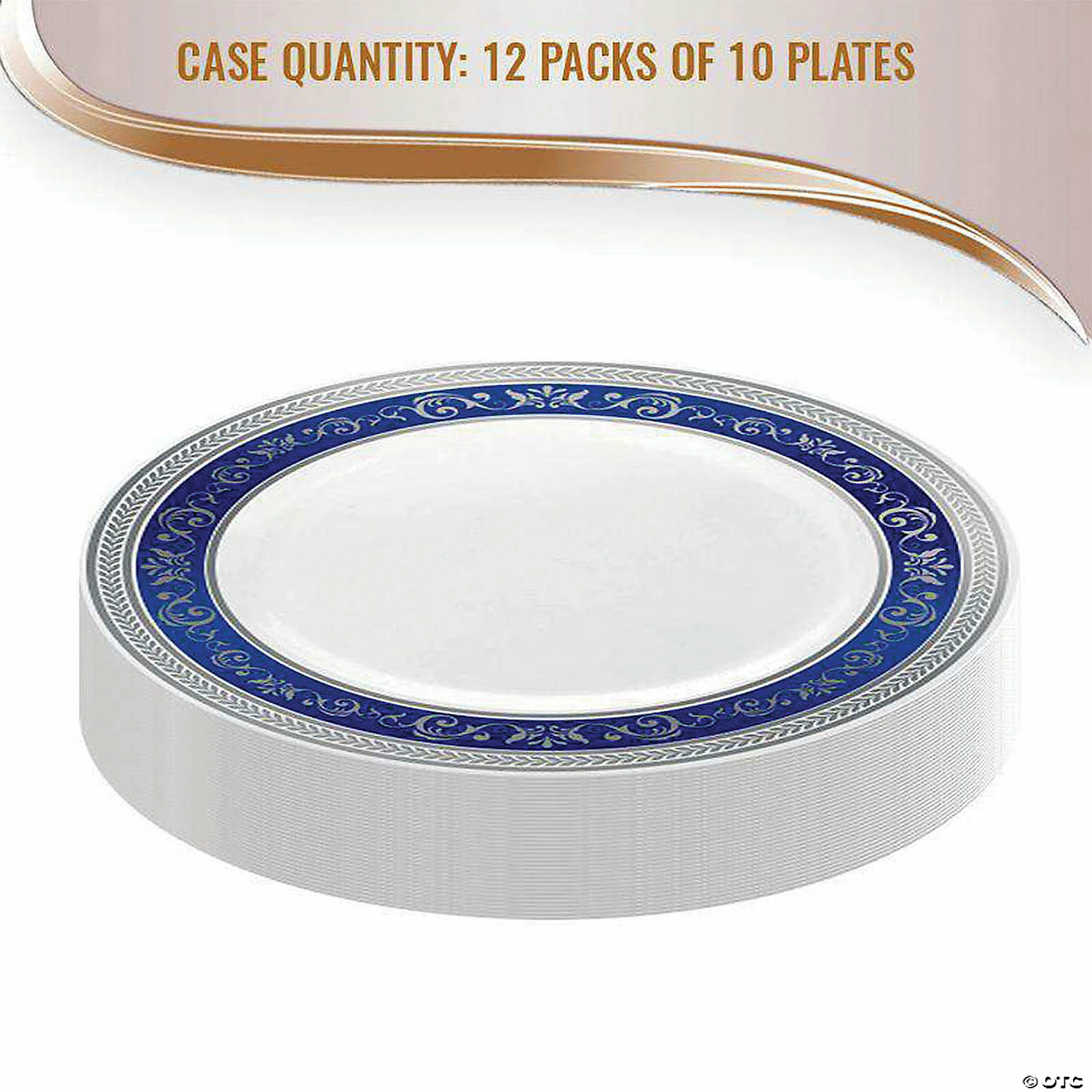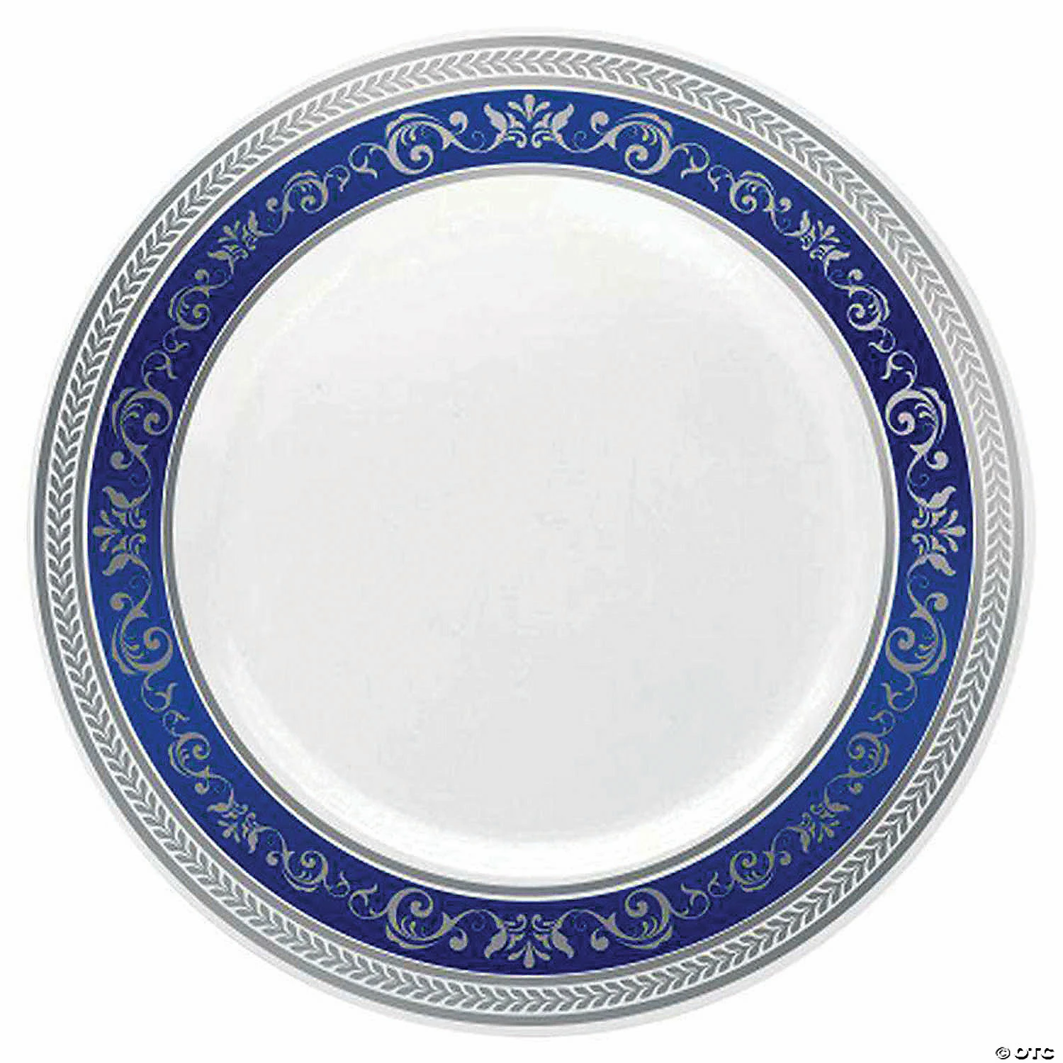 • Approx. inner diameter: 7 ¾”• Approx. outer diameter: 10 ¼”• Approx. outer rim diameter: 1 ¾”• Case quantity: 12 packs of 10 plates• Color: White with Royal Blue and Silver Rim• Shape: Round• Material: Plastic• Disposable: One-time, single party use• Recycling code: #6 PS Polystyrene• BPA-free: Yes Special Shipping Information: This item ships separately from other items in your order. This item cannot ship to a P.O. Box. This item may be subject to additional processing days. ITEM IS NOT ELIGIBLE FOR EXPEDITED SHIPPING