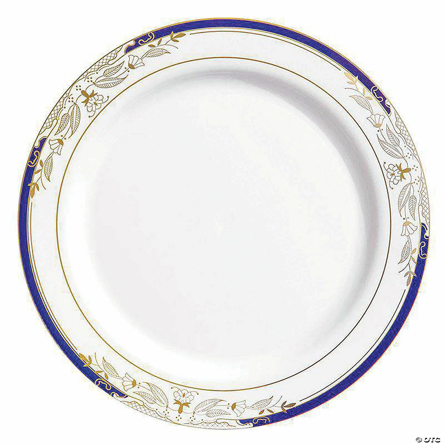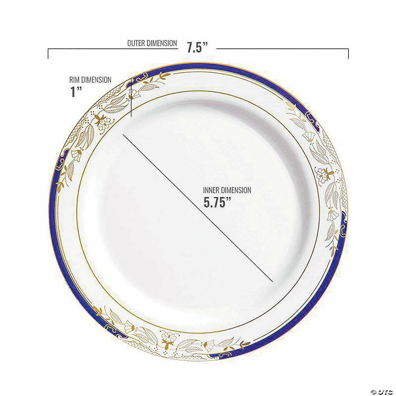 β’ Approx. inner diameter: 5 ΒΎ”β’ Approx. outer diameter: 7 Β½”β’ Approx. outer rim diameter:Β 1″β’ Case quantity: 12 packs of 10 platesβ’ Color: White with Blue and Gold Rimβ’ Shape: Roundβ’ Material: Plasticβ’ Disposable: One-time, single party useβ’ Recycling code: #6 PS Polystyreneβ’ BPA-free: Yes Special Shipping Information: This item ships separately from other items in your order. This item cannot ship to a P.O. Box. This item may be subject to additional processing days. ITEM IS NOT ELIGIBLE FOR EXPEDITED SHIPPING