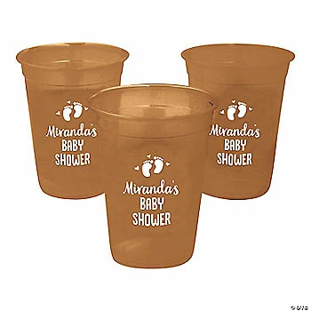 Celebrate the Momma-to-Be with these personalized plastic cups. Featuring a cute baby feet and hearts image along with personalized text, these disposable plastic cups are the perfect addition to baby shower supplies. Have these cups available at the baby showerβs beverage station for a presentation that will impress guests β and the Mom-to-Be! Plastic. (40 pcs. per unit) 5 1/2″ 16 oz. Personalize with 3 lines of text. © OTC
