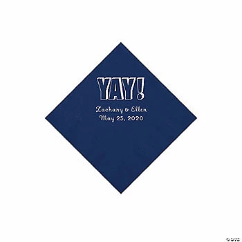 Commemorate your big day by adding Personalized Yay! Beverage or Luncheon Napkins to your wedding supplies. Custom napkins are a fun and affordable way to add a personal touch to your wedding reception, engagement party and bridal shower decorations. Personalize with the couples name and wedding date and use for all the special events leading up to the wedding ceremony. With so many colors to choose from, you can order custom napkins to complement the wedding colors for the wedding reception and order a smaller batch for the other wedding parties prior to the big day. Our low prices allow you to consider mixing and matching colors to stack throughout the wedding reception, couples shower, bachelorette party, etc. Yay! Personalize with 2 lines of text. Printed with gold or silver foil. Paper. (50 pcs. per unit) Beverage, 5″; luncheon, 6 1/2″. Not microwave safe. © OTC
