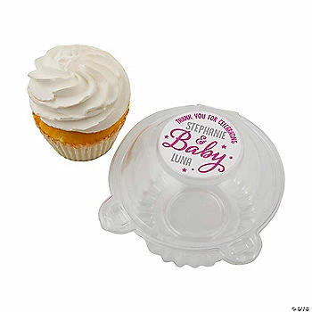 Celebrate the bun-in-the-oven with a cupcake in these personalized clamshells! Each container features both the mother and infantβs name, making these perfect for any baby shower. Load these up with cupcakes and other sweet treats to hand to your guests to take home with them as a party favor. Personalize with 2 lines of text. Plastic. 4 1/2″ x 3 1/2″ x 3″ Simple assembly required to apply personalized sticker. Β© OTC