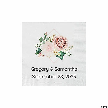 From love at first blush to happily ever after, your special day deserves dΓ©cor worthy of your blissful amour. Enter these custom floral napkins, featuring romantic flowers in soft pinks and greens. Just add your names and wedding date for truly unforgettable wedding tableware thatβs as pretty to look at as it is useful for cleaning up spills! Personalize with 2 lines of text. Paper. (50 pcs. per unit) 5″ Β© OTC