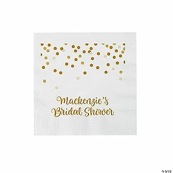 Add to the celebratory feel of your event with these fun paper napkins. Featuring a cute confetti pattern and personalized text, these disposable napkins are great for bridal showers, wedding receptions, fundraisers or anniversary dinners. Impress guests with these unique napkins and help make clean-up easier! Paper. (50 pcs. per unit) 5″ Personalize with 2 lines of text. © OTC