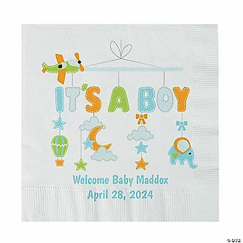 Itβs a bird, itβs a plane, itβs aβ¦boy! These custom party napkins feature a mobile with such fun designs as an airplane, elephant and hot air balloon, along with letters to spell out βitβs a boyβ and space to add your own message. Great for baby showers, gender reveal parties or events to introduce your little bundle of joy to loved ones, this party tableware stands out well on its own or can be paired with other party decorations, tableware and supplies found on this site. Personalize with 2 lines of text. Paper. (50 pcs. per unit) 6 1/2″ Β© OTC