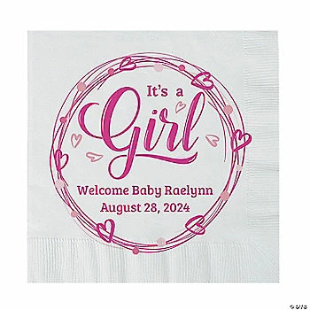 Sugar and spice and everything nice! Celebrate your new addition with these sweet-as-can-be custom napkins. Perfect for baby showers or events to introduce your baby girl to loved ones, this party tableware features pink hearts, an βItβs a Girlβ message and space to have your own message printed. Personalize with 2 lines of text. Paper. (50 pcs. per unit) 6 1/2″ Β© OTC