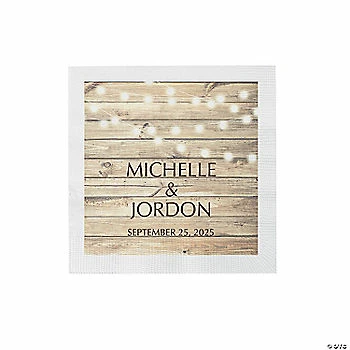 Extend the rustic theme of your wedding reception to the disposable tableware with these impressive napkins. Featuring a rustic look and personalized text, these paper napkins are the perfect choice for a rustic wedding reception, engagement party or anniversary celebration. Add personalized text for an impressive look guests will love. Paper. (50 pcs. per unit) 5″ Personalize with 4 lines of text. © OTC