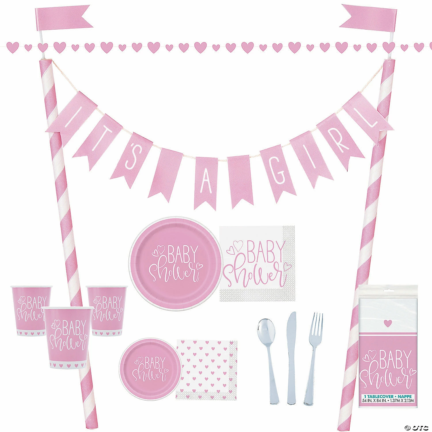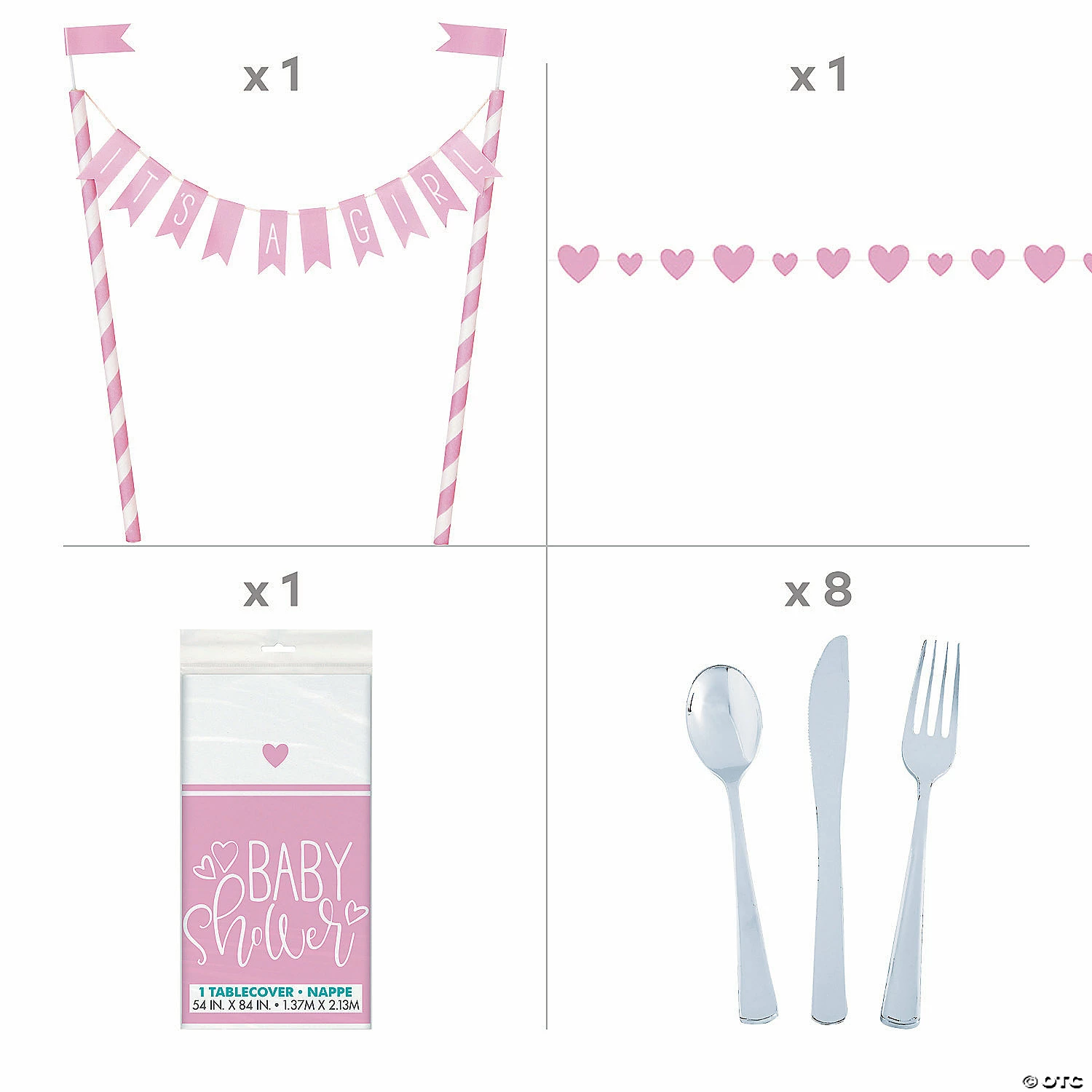 Pink hearts and love! Throw a baby shower for a mom-to-be who canβt wait to meet her darling little girl with this cute and easy tableware kit for up to 8 guests. With all the plates, napkins, cups, decorations and more youβll need, this helpful kit makes the process of putting together a baby shower easy! (83 pcs. per unit) Assortment may vary.Includes:β’ 8 Paper Pink Hearts Baby Shower Cups (3 1/4″ 9 oz.)β’ 1 Paper Pink Hearts Baby Shower Banner Cake Topper (5″ x 8 3/4″)β’ 1 Paper Pink Hearts Baby Shower Cutout Garland (9 ft.)β’ 8 Paper Pink Hearts Baby Shower Dessert Plates (7″)β’ 8 Paper Pink Hearts Baby Shower Dinner Plates (9″)β’ 16 Paper Pink Hearts Baby Shower Luncheon Napkins (6 1/2″)β’ 1 Plastic Pink Hearts Baby Shower Tablecloth (54″ x 84″ Disposable.)β’ 16 Paper Pink Hearts Baby Shower Beverage Napkins (5″)β’ 8 Plastic Premium Metallic Silver Cutlery Sets (3 pcs. per set. Includes 7″ spoons, 7-3/4″ knives and 7-1/2″ forks.)