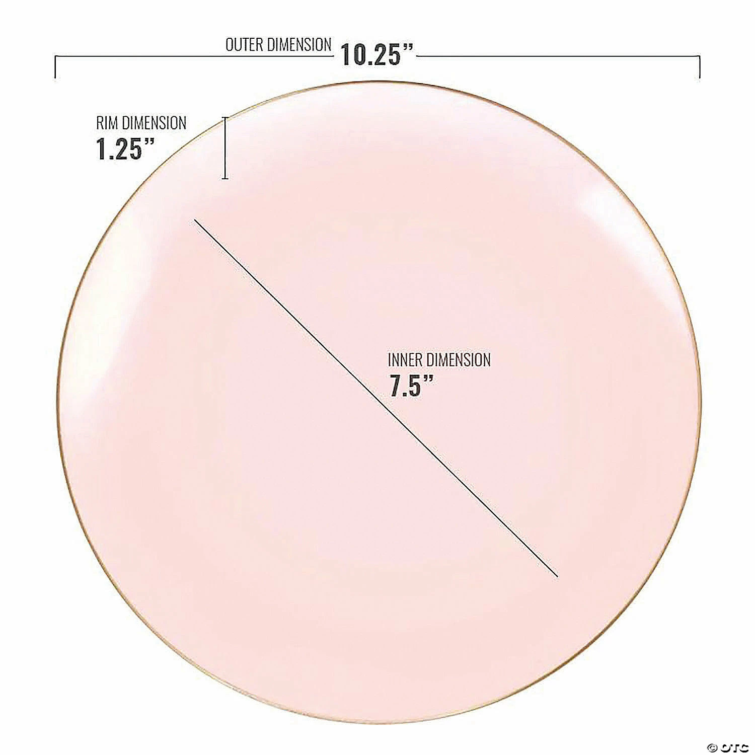 β’ 80 pcs combo pack:Β 40 dinner plates and 40 salad platesβ’ Dinner plate SKU: 930PGβ’ Dinner plate approx. outer diameter: 10 ΒΌ”β’ Dinner plate approx. outer rim diameter: 1 ΒΌ”β’ Dinner plate approx. inner diameter: 7 Β½”β’ Salad plate SKU: 937PGβ’ Salad plate approx. outer diameter: 7 Β½”β’ Salad plate approx. outer rim diameter:Β 1 ΒΌ”β’ Salad plate approx. inner diameter: 5 Β½”β’ Color:Β Pink with Gold Rimβ’ Shape:Β Roundβ’ Material:Β Plasticβ’ Disposable:Β One-time, single party useβ’ Recycling code:Β #6 PS Polystyreneβ’ BPA-free:Β YesΒ Β Special Shipping Information:Β This item ships separately from other items in your order.Β This item cannot ship to a P.O. Box.Β This item may be subject to additional processing days.Β Β Item is not eligible for expedited shipping.Β Β Β Β You may initiate a return for unused items within 30 days, if the items are in original packaging with all original materials included with the shipment.
