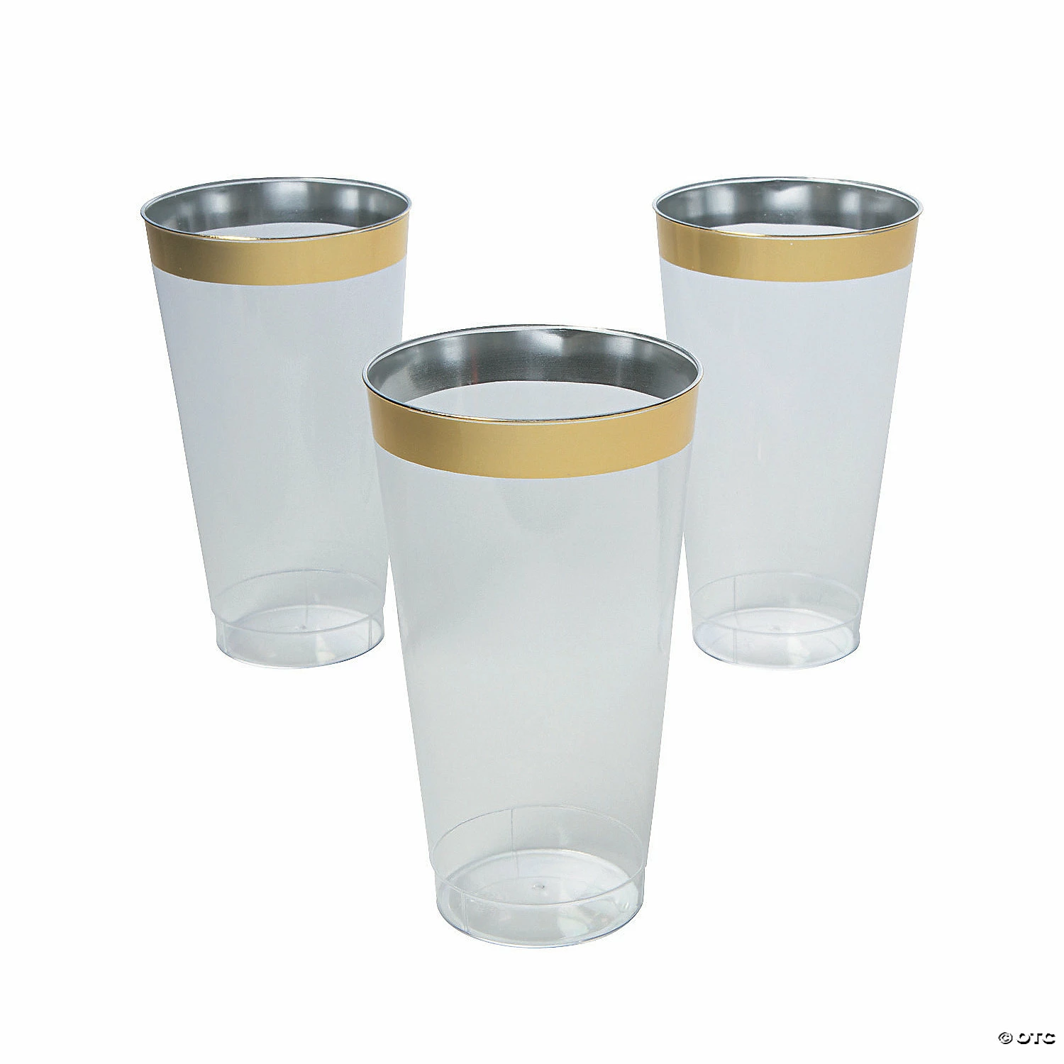 Want to add the elegance of gold to your wedding supplies without the cost of the real thing? Rimmed with a glitzy golden hue, these tumblers are a must-have for weddings, New Yearβs Eve celebrations, anniversaries or any affair with an elegant atmosphere. Add a Midas-approved touch of gold to the wedding bar by setting these next to beverages. These tumblers are upscale, stylish and disposable, so cleanup is a breeze. Simply put, these are the gold standard of wedding tumblers! Plastic. (16 pcs. per unit) 5 1/2″ 16 oz. Not dishwasher or microwave safe. Hand wash only.