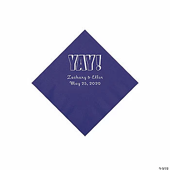 Commemorate your big day by adding Personalized Yay! Beverage or Luncheon Napkins to your wedding supplies. Custom napkins are a fun and affordable way to add a personal touch to your wedding reception, engagement party and bridal shower decorations. Personalize with the couples name and wedding date and use for all the special events leading up to the wedding ceremony. With so many colors to choose from, you can order custom napkins to complement the wedding colors for the wedding reception and order a smaller batch for the other wedding parties prior to the big day. Our low prices allow you to consider mixing and matching colors to stack throughout the wedding reception, couples shower, bachelorette party, etc. Yay! Personalize with 2 lines of text. Printed with gold or silver foil. Paper. (50 pcs. per unit) Beverage, 5″; luncheon, 6 1/2″. Not microwave safe. ยฉย OTC