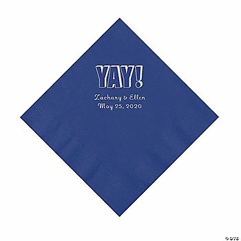 Commemorate your big day by adding Personalized Yay! Beverage or Luncheon Napkins to your wedding supplies. Custom napkins are a fun and affordable way to add a personal touch to your wedding reception, engagement party and bridal shower decorations. Personalize with the couples name and wedding date and use for all the special events leading up to the wedding ceremony. With so many colors to choose from, you can order custom napkins to complement the wedding colors for the wedding reception and order a smaller batch for the other wedding parties prior to the big day. Our low prices allow you to consider mixing and matching colors to stack throughout the wedding reception, couples shower, bachelorette party, etc. Yay! Personalize with 2 lines of text. Printed with gold or silver foil. Paper. (50 pcs. per unit) Beverage, 5″; luncheon, 6 1/2″. Not microwave safe. © OTC