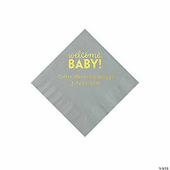 Discount 💯 Silver Welcome Baby Personalized Napkins with Gold Foil – 50 Pc. Beverage 🎁