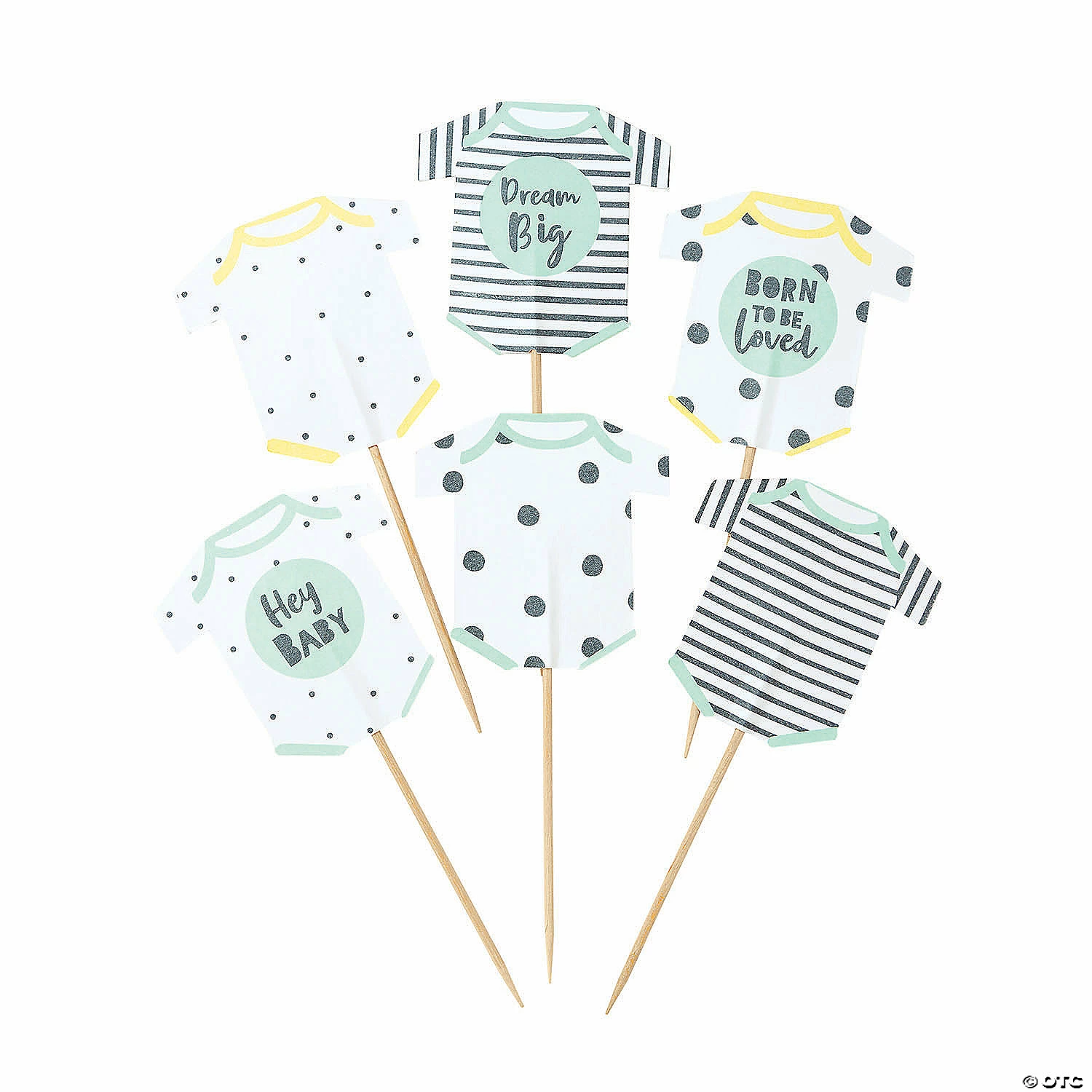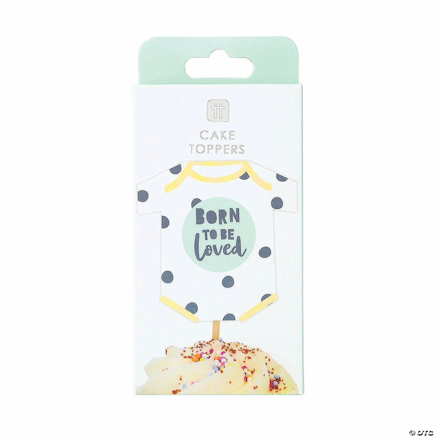 Top your celebratory cupcakes with these adorable cupcake picks! Each icon features a oneside or romper with eye-catching designs and assorted phrases like “Hey, baby” and “Born to be loved”. A great addition to both gender reveal party supplies and baby shower supplies for a gender neutral shower. Cardstock icons on wooden sticks. 6 1/2″ © Talking Tables Ltd.