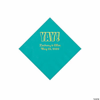 Commemorate your big day by adding Personalized Yay! Beverage or Luncheon Napkins to your wedding supplies. Custom napkins are a fun and affordable way to add a personal touch to your wedding reception, engagement party and bridal shower decorations. Personalize with the couples name and wedding date and use for all the special events leading up to the wedding ceremony. With so many colors to choose from, you can order custom napkins to complement the wedding colors for the wedding reception and order a smaller batch for the other wedding parties prior to the big day. Our low prices allow you to consider mixing and matching colors to stack throughout the wedding reception, couples shower, bachelorette party, etc. Yay! Personalize with 2 lines of text. Printed with gold or silver foil. Paper. (50 pcs. per unit) Beverage, 5″; luncheon, 6 1/2″. Not microwave safe. © OTC