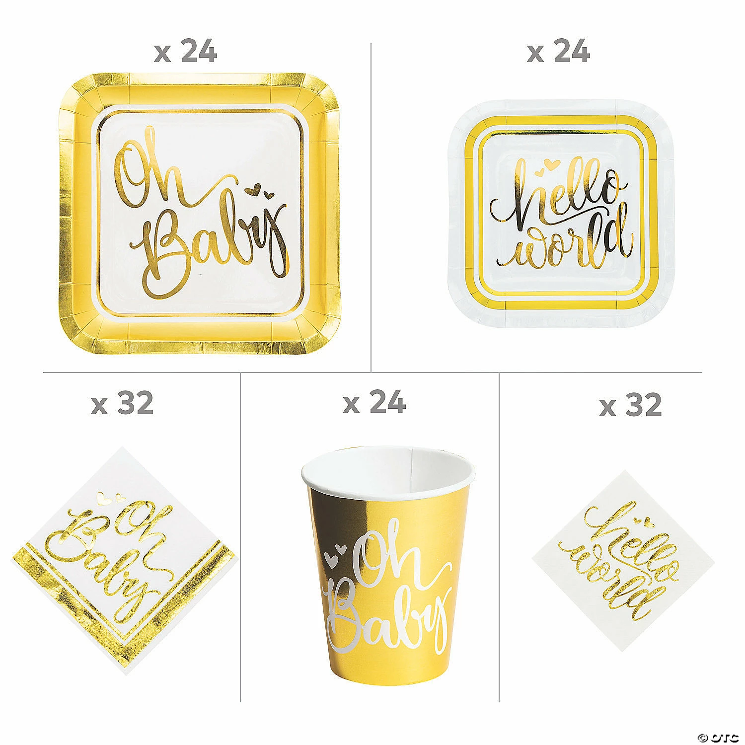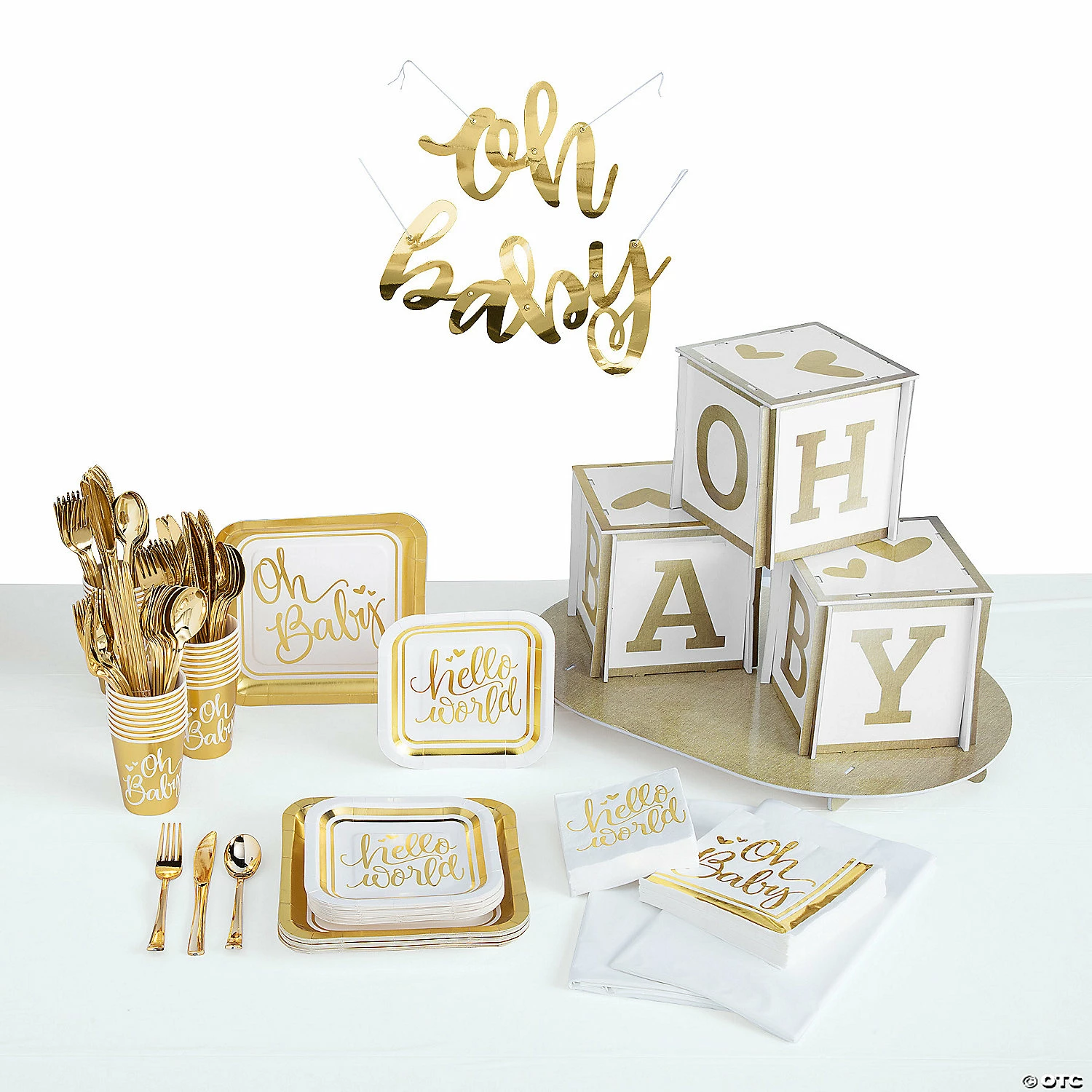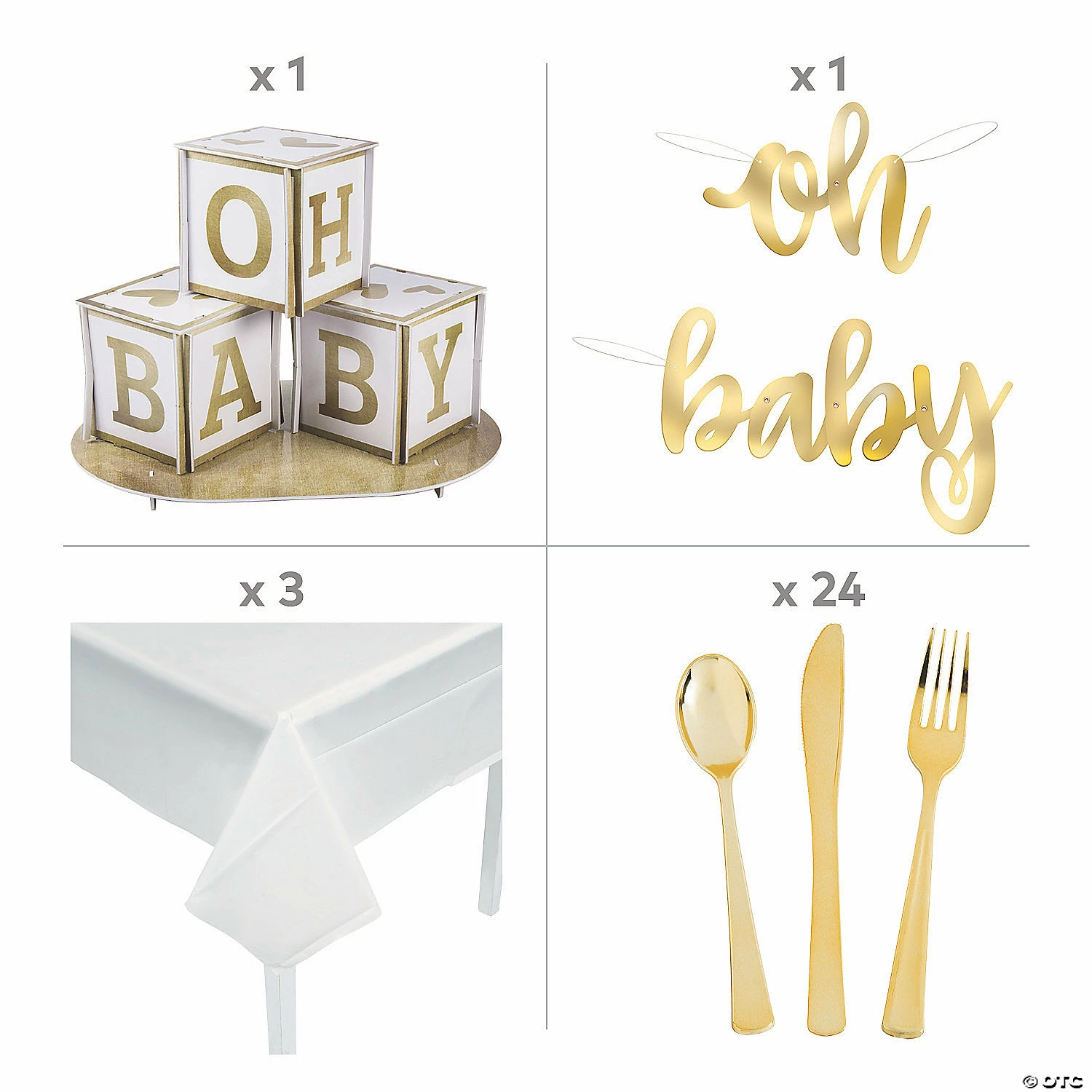 This baby shower will impress guests with its lovely gold and white accents! This gold and white baby shower tableware kit has everything needed for a sophisticated baby shower for up to 24 guests. Be sure to check out all the other baby shower supplies available here on this website, from games to party favors. Mom-to-be will be pleased! (213 pcs. per unit) Assortment may vary. Simple assembly required. Includes:• 1 Foam Baby Blocks Treat Stand (16″ x 21 diam. Simple assembly required.)• 24 Paper Oh Baby Gold Cups (3 3/4″ 9 oz.)• 32 Paper Oh Baby Gold Beverage Napkins (5″ Not microwave safe.)• 24 Paper Oh Baby Gold Dessert Plates (7″ Not microwave safe.)• 24 Paper Oh Baby Gold Dinner Plates (9″ Not microwave safe.)• 32 Paper Oh Baby Gold Luncheon Napkins (6 1/2″)• 1 Cardstock Oh Baby Script Garland (9 ft.)• 3 Plastic Premium Metallic Gold Cutlery Sets (Includes eight 7″ spoons, eight 7-3/4″ knives and eight 7-1/2″ forks.)• 3 Plastic White Tablecloth (54″ x 108″ Disposable.)